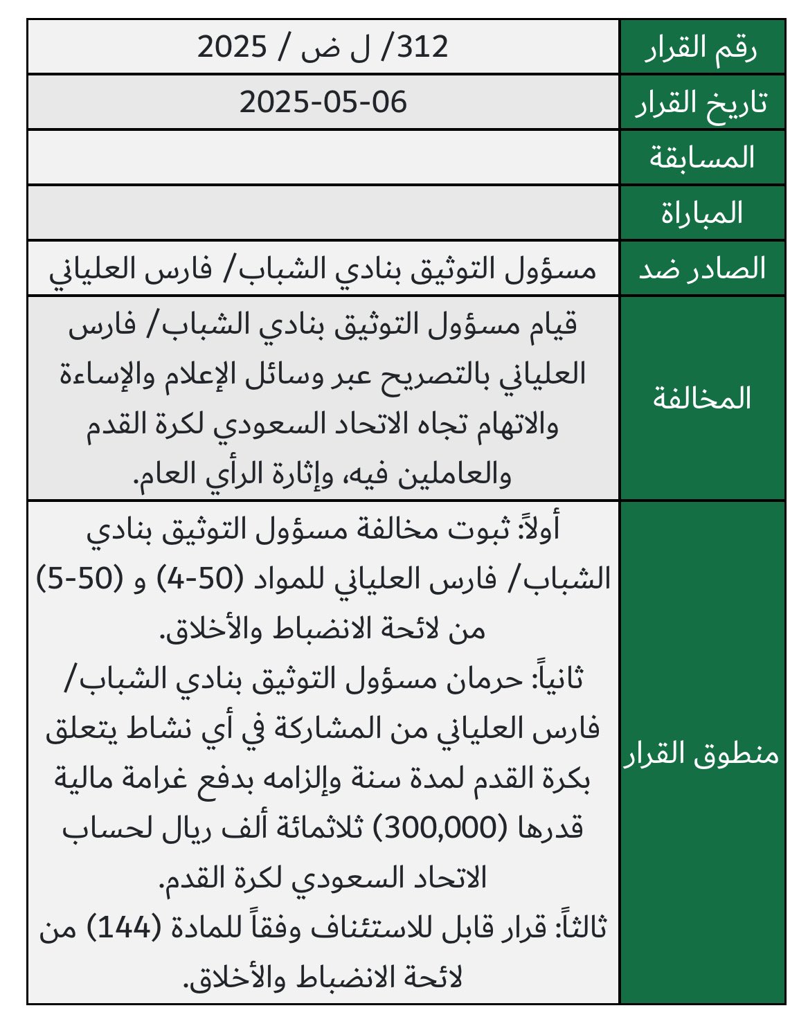 وجاء في قرارات اللجنة إيقاف فارس العلياني، مسؤول التوثيق بنادي الشباب، عن ممارسة أي نشاط رياضي لمدة عام كامل، بالإضافة إلى تغريمه 300 ألف ريال سعودي. وأوضحت اللجنة أن العقوبة جاءت بسبب تصريحاته الإعلامية التي تضمنت اتهامات مسيئة للاتحاد السعودي والعاملين فيه، ومحاولته إثارة الرأي العام.