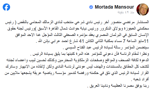 وكتب مرتضى منصور، عبر صفحته الرسمية بموقع التواصل الاجتماعي "فيس بوك": "المستشار مرتضى منصور آخر رئيس نادي شرعي منتخب لنادي الزمالك المحامي بالنقض (رئيس محكمتي العجوزة وبولاق الدكرور، ورئيس نيابة حوادث شمال القاهرة الأسبق) ورئيس لجنة حقوق الإنسان السابق في البرلمان المصري يعقد مؤتمره الصحفي الثالث المؤجل غدا الأحد الموافق 11مايو الساعة 7 مساء بمكتبة الثاني الكائن 41 شارع أحمد عرابي".