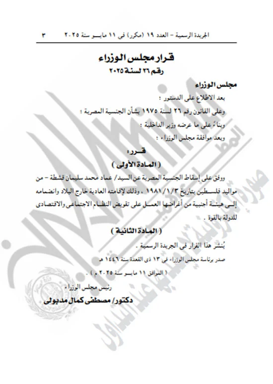 أصدر الدكتور مصطفى مدبولي، رئيس مجلس الوزراء، قرارا بإسقاط الجنسية المصرية عن كل من عماد محمد سليمان قشطة من مواليد فلسطين، وذلك لإقامته خارج البلاد وانضمامه لهيئة أجنبية من شأنها تقويض النظام الاجتماعي والاقتصادي للدولة بالقوة.