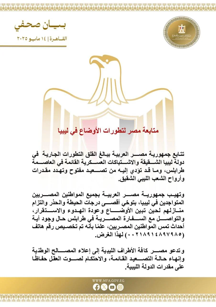 وتدعو مصر كافة الأطراف الليبية إلى إعلاء المصالح الوطنية وإنهاء حالة التصعيد القائمة، والاحتكام لصوت العقل حفاظا على مقدرات الدولة الليبية.