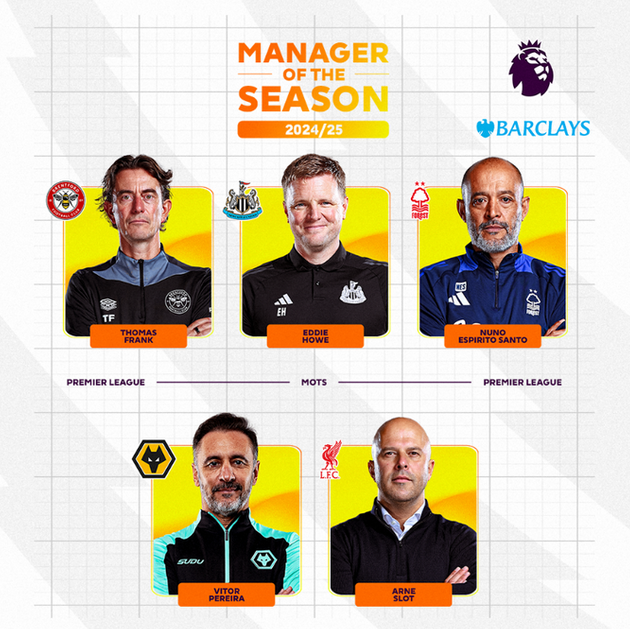 أعلنت رابطة الدوري الإنجليزي الممتاز، قائمة المرشحين لجائزة أفضل مدرب في الموسم الحالي من مسابقة البريميرليج 2024-2025.