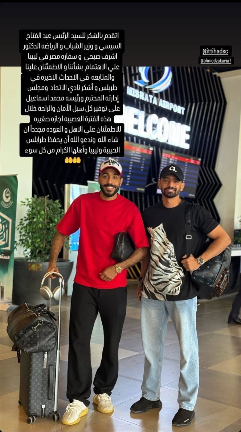 وكتب محمود كهربا عبر حسابه الرسمي على موقع "إنستجرام": "أتقدم بالشكر لـ الرئيس عبد الفتاح السيسي ووزير الشباب والرياضة الدكتور أشرف صبحي وسفارة مصر في ليبيا، على الاهتمام بشأننا والاطمئنان علينا والمتابعة في الأحداث الأخيرة في طرابلس".