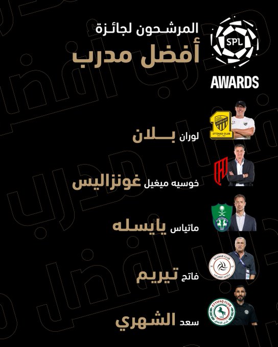 وأكدت رابطة الدوري السعودي للمحترفين، أن الفرنسي لوران بلان مدرب الاتحاد، والإسباني خوسيه ميجيل جونزاليس مدرب القادسية، والألماني مانياس يايسلة مدرب أهلي جدة، والتركي فاتح تريم مدرب الشباب، وسعد الشهري مدرب الاتفاق، مرشحين لـ جائزة أفضل مدرب خلال الموسم الحالي.