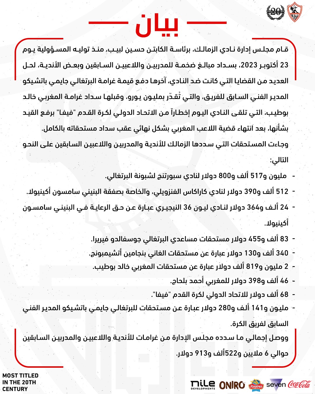ووصل إجمالي ما سدده مجلس الإدارة من غرامات للأندية واللاعبين والمدربين السابقين حوالي 6 ملايين و522 ألف و913 دولار.