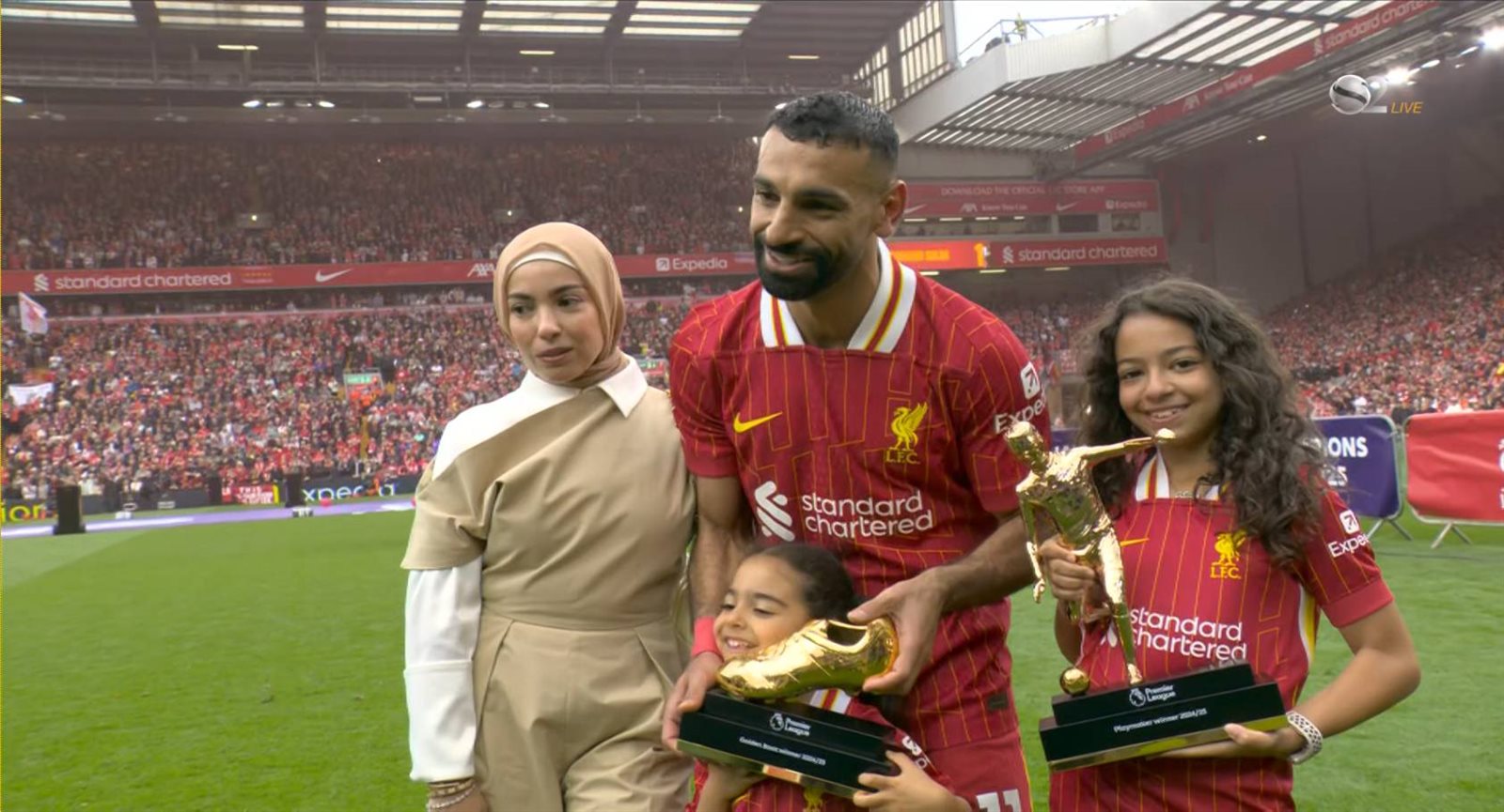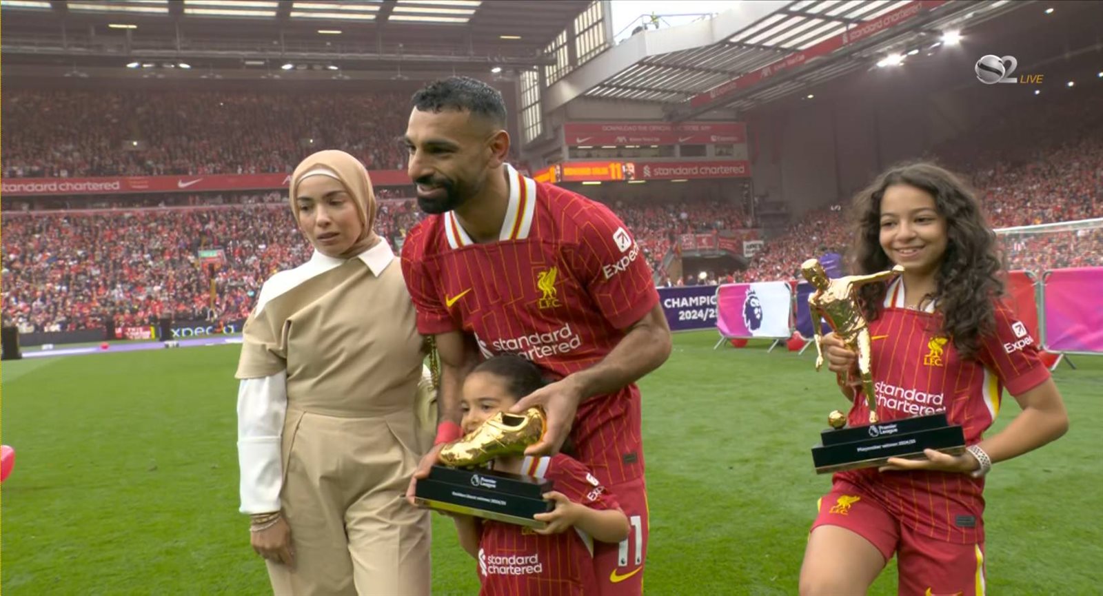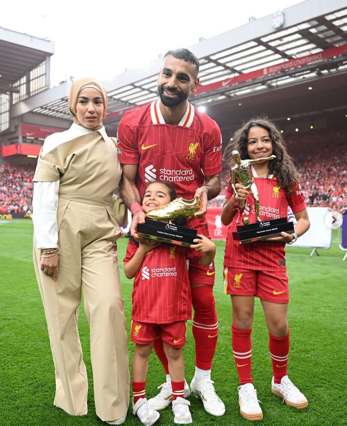 واحتفل صلاح بالجائزتين مع زوجته وابنتيه مكة وكيان على ملعب أنفيلد، في جو عائلي رائع.