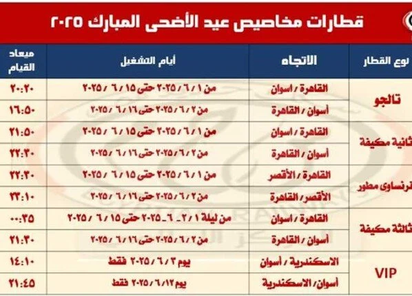 تشمل مواعيد قطارات عيد الأضحى الإضافية 2025 تشغيل قطارات مخصصة لأبناء النوبة والاتحاد النوعي ونادي الجعافرة، وذلك في أيام 4 و13 و14 يونيو، على خطوط «القاهرة -أسوان - الإسكندرية» والعكس والذي تتمثل في الآتي: