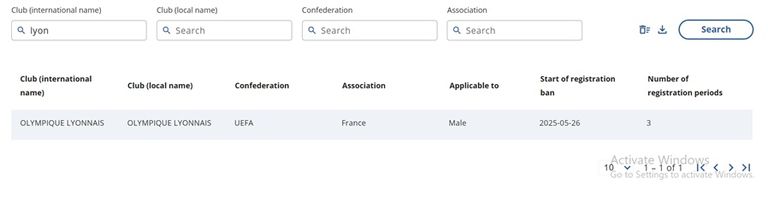 ووضع الموقع الرسمي للاتحاد الدولي لكرة القدم "فيفا" اسم ليون على قائمة الأندية التي يشملها الحظر من إبرام التعاقدات وتسجيلها بداية من 26 مايو 2025.