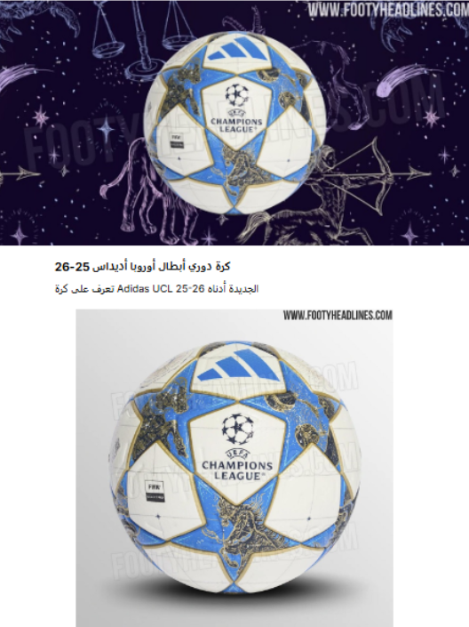 وأفادت شبكة FOOTY HEADLINES الإنجليزية، والمهتمة بـ تسريبات وتصميمات قمصان الأندية والمنتخبات حول العالم، أن كرة دوري أبطال أوروبا لموسم 2025-2026، ستكون مستوحاة من الأبراج الـ12 وكوكباتها النجمية.