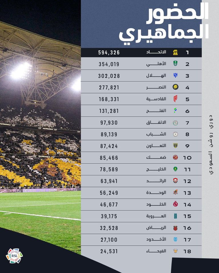 كشف الحساب الرسمي لدوري "روشن" على موقع "إكس" للتواصل الاجتماعي عن إجمالي الحضور الجماهير في موسم المسابقة، وحصة كل ناد من هذا الرقم.