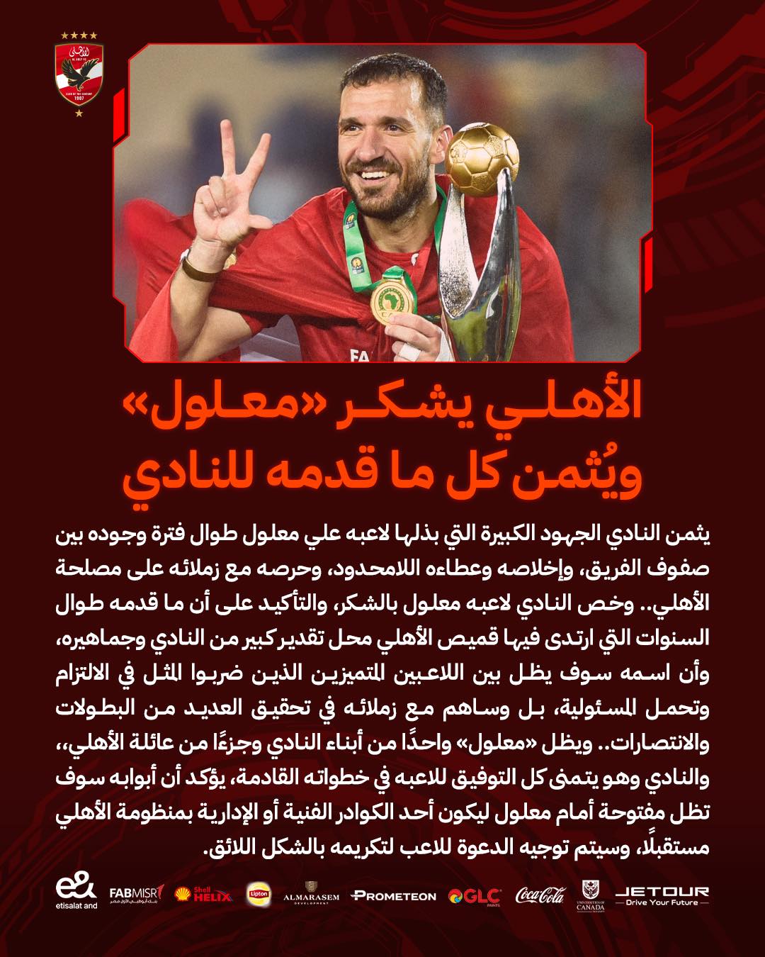 واختتم: "ويظل معلول واحدًا من أبناء النادي وجزءًا من عائلة الأهلي، والنادي وهو يتمنى كل التوفيق للاعبه في خطواته القادمة، يؤكد أن أبوابه سوف تظل مفتوحة أمام معلول ليكون أحد الكوادر الفنية أو الإدارية بمنظومة الأهلي مستقبلًا، وسيتم توجيه الدعوة للاعب لتكريمه بالشكل اللائق".