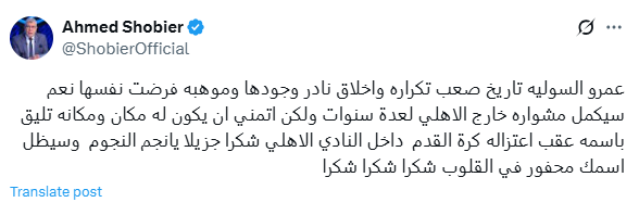 وكتب شوبير عبر حسابه الرسمي على منصة "إكس": "عمرو السولية تاريخ صعب تكراره، وأخلاق نادر وجودها وموهبة فرضت نفسها".