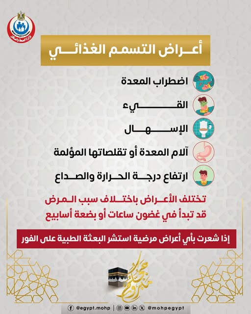ومن جانبها أوضحت وزارة الصحة والسكان في منشور خاص بها على صفحتها الرسمية بموقع فيس بوك، أن أعراض التسمم الغذائي تختلف باختلاف سبب المرض، وقد تبدأ في غضون ساعات أو بضعة أسابيع، وأبرز أعراض التسمم الغذائي تشمل اضطراب المعدة، القيء، الإسهال، آلام المعدة أو تقلصاتها المؤقتة، وارتفاع درجة الحرارة والصداع.