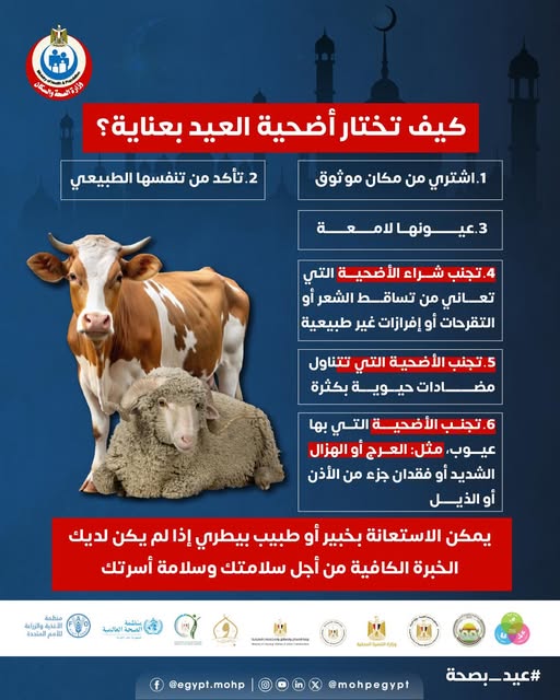 أجابت وزارة الصحة والسكان المصرية على سؤال كيفية اختيار أضحية العيد، وأكدت في منشور لها على صفحتها الرسمية بموقع فيس بوك، ضرورة التأكد مما يلي عند شراء الأضحية: