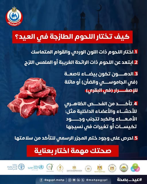 أوضحت وزارة الصحة والسكان المصرية، مواصفات اللحوم الحمراء الطازجة، حيث تُعد اللحوم الحمراء من الأطباق الأساسية خاصة في المناسبات والأعياد مثل عيد الأضحى المبارك، ولكن للاستمتاع بمذاقها الرائع والطراوة التي نحب، فمن الضروري معرفة كيفية اختيار اللحم الطازج، وكيفية تحضيره بأمان أيضا، بنصائح وزارة الصحة حيث 5 قواعد تساعد في اختيار اللحوم الطازجة بعيد الأضحى كالتالي: