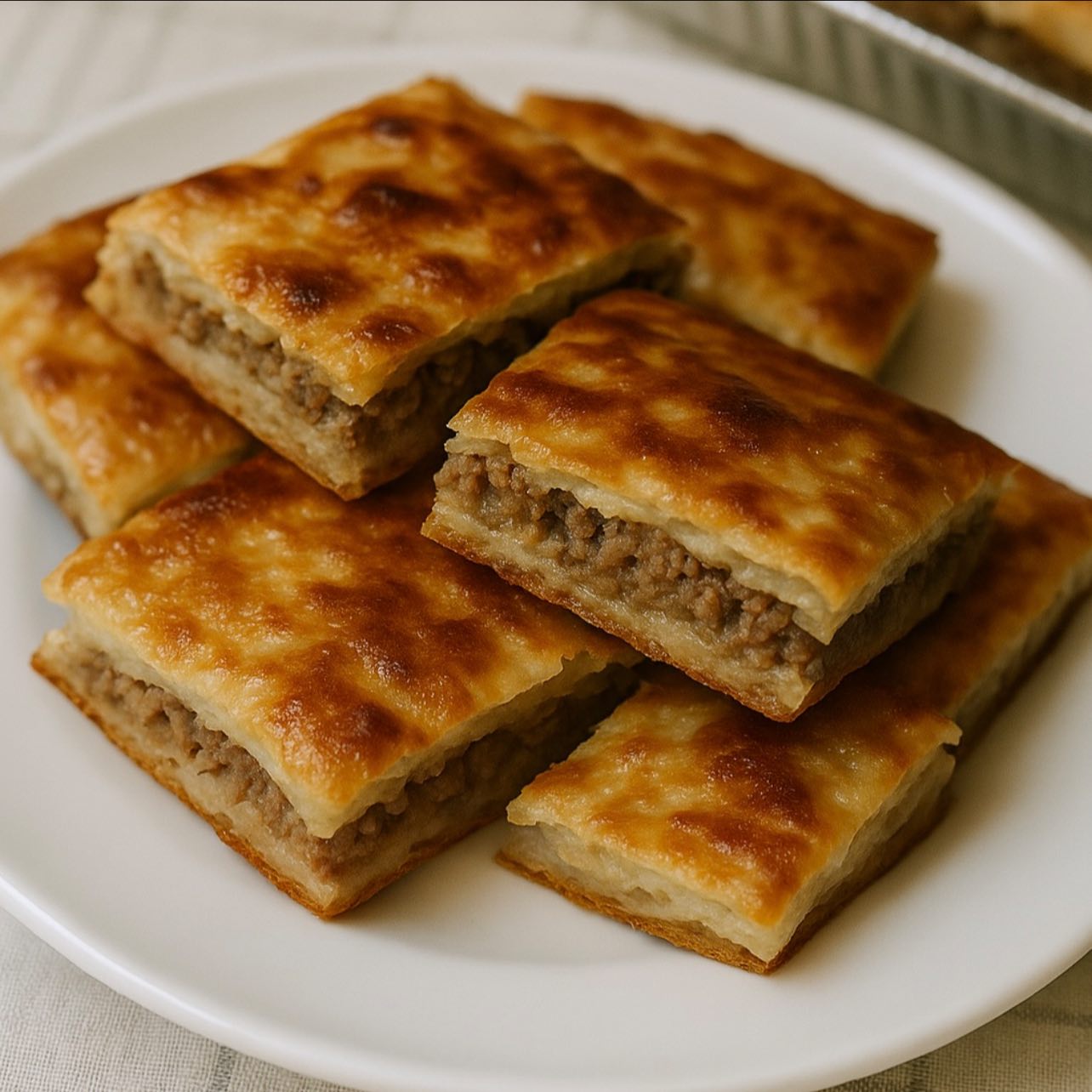 - ضعي طبقة عصاج اللحمة المفرومة في منتصف الرقاق ثم أكملي فوقه باقي طبقات الرقاق المبلل بالشوربة والحليب.