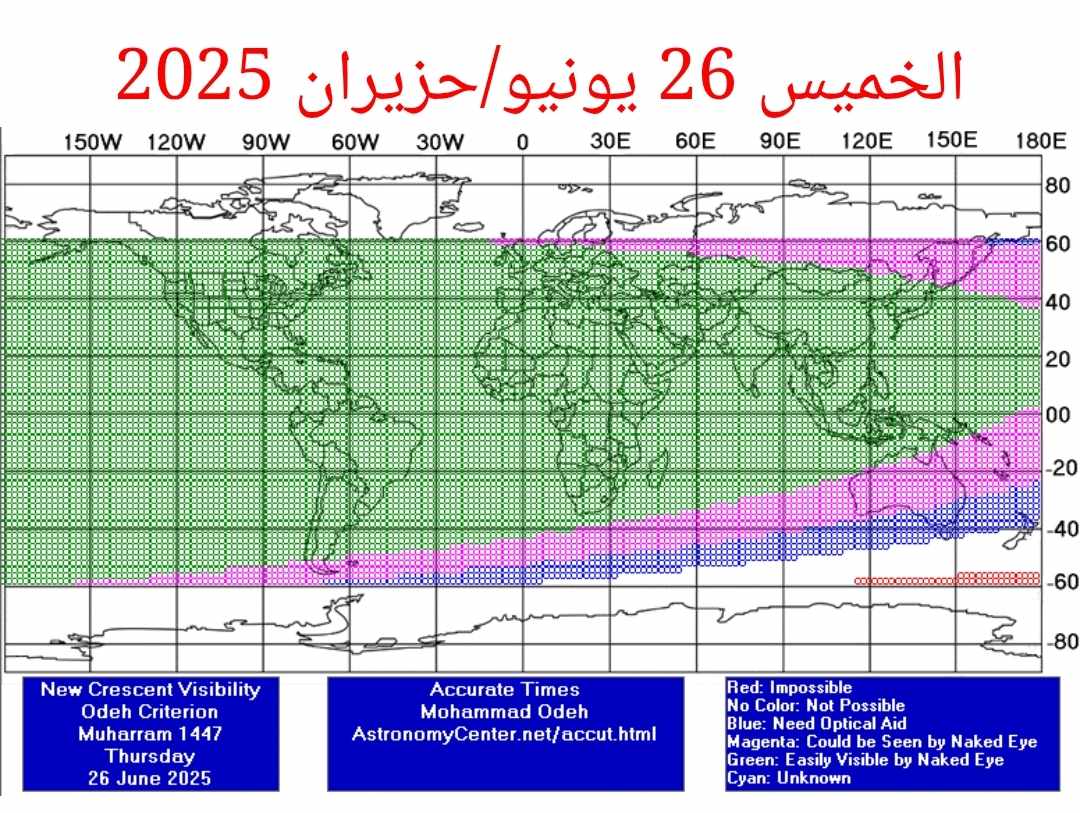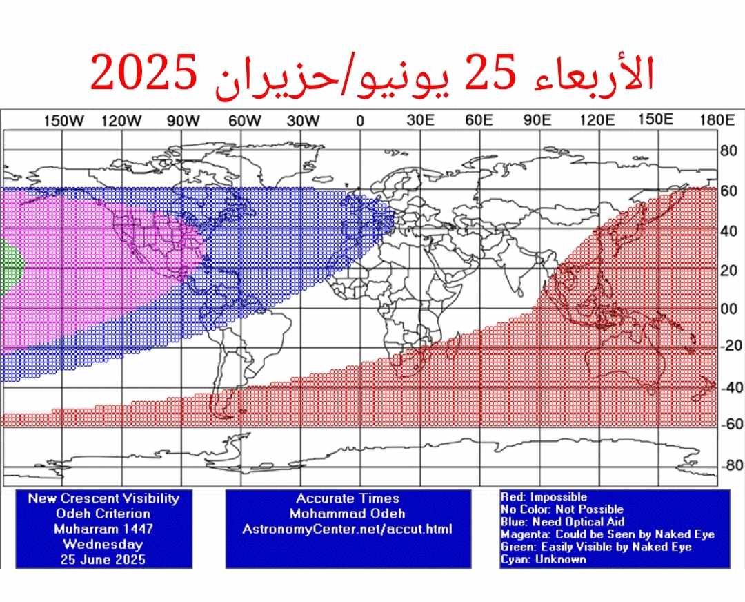 سيحدث الاقتران المركزي "المحاق المركزي" يوم الأربعاء 25 يونيو 2025، الساعة 10:32 دقيقة بالتوقيت العالمي، وهناك إمكانية رؤية الهلال يوم الأربعاء 25 يونيو، ويوم الخميس 26 يونيو، وباعتماد التقويم الهجري العالمي المبني على حساب إمكانية رؤية الهلال، فإن بداية الشهر في النطاق الشرقي تكون يوم الخميس 26 يونيو 2025، وبداية الشهر في النطاق الغربي تكون يوم الخميس 26 يونيو 2025.