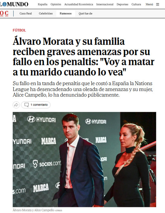 كشفت تقارير صحفية إسبانية، عن أن ألفارو موراتا مهاجم فريق جالطة سراي التركي ومنتخب إسبانيا، تعرض لـ رسائل تهديد بالقتل، وذلك بعد أن تسبب في خسارة منتخب بلاده أمام البرتغالي في نهائي دوري الأمم الأوروبية.