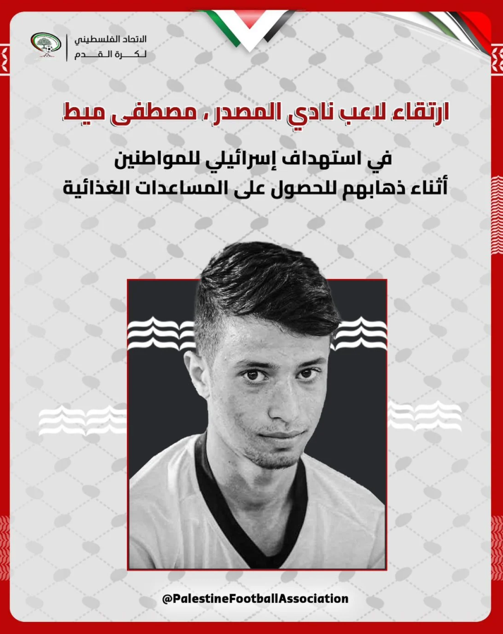 وقال الاتحاد الفلسطيني لكرة القدم في بيان مقتضب: "ارتقاء مصطفى ميط لاعب نادي المصدر، في استهداف إسرائيلي للمواطنين خلال الحصول على المساعدات الغذائية".
