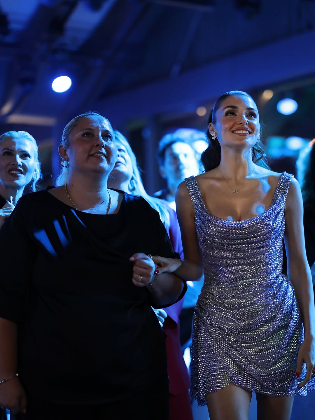وأطلت الممثلة التركية بفستان بحمالات وياقة دائرية، قصير باللون الفضي البرّاق من علامة Nedo لـ Nedret Taciroglu، تميّز بتصميم منسدل مع تموجات أفقية مزمزمة.