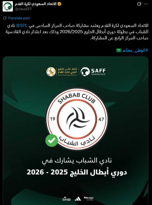 وأعلن الاتحاد السعودي لكرة القدم عبر حسابه الرسمي على موقع التواصل الاجتماعي "إكس": "الاتحاد السعودي لكرة القدم يعتمد مشاركة صاحب المركز السادس في الدوري السعودي للمحترفين نادي الشباب في بطولة دوري أبطال الخليج 2026/2025 وذلك بعد اعتذار نادي القادسية صاحب المركز الرابع عن المشاركة".