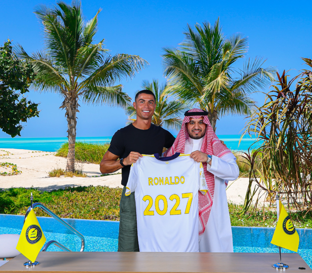 ثم نشر النصر صورة تجمع بين عبد الله بن عبدالرحمن الماجد رئيس النادي ورونالدو وهما يحملان قميص الدون مكتوب عليه 2027، للإعلان عن تجديد عقد قائد البرتغال لمدة موسمين.