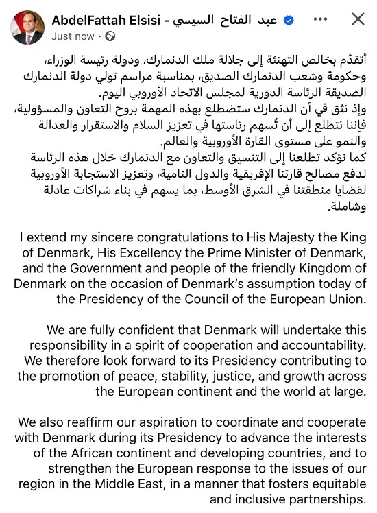 وكتب الرئيس السيسى- عبر حساباته الرسمية بمواقع التواصل الاجتماعى: "وإذ نثق في أن الدنمارك ستضطلع بهذه المهمة بروح التعاون والمسؤولية، فإننا نتطلع إلى أن تُسهم رئاستها في تعزيز السلام والاستقرار والعدالة والنمو على مستوى القارة الأوروبية والعالم".