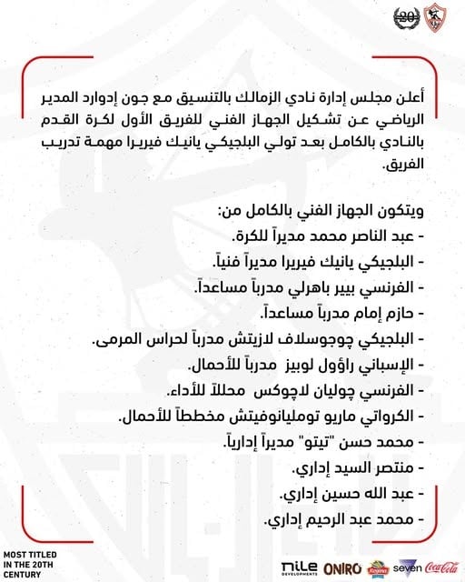 بقيادة فيريرا.. الزمالك يعلن التشكيل الكامل للجهازين الفني والإداري