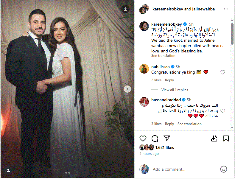 نشر كريم السبكي صورًا من حفل زفافه الجديد، وكتب معلقًا بآية من القرآن الكريم: "وَاجًا لِّتَسْكُنُوا إِلَيْهَا وَجَعَلَ بَيْنَكُم مَّوَدَّةً وَرَحْمَةً، تزوجنا أنا وجالين وهبة، فصل جديد مليء بالسلام والمحبة وعلى بركة الله."