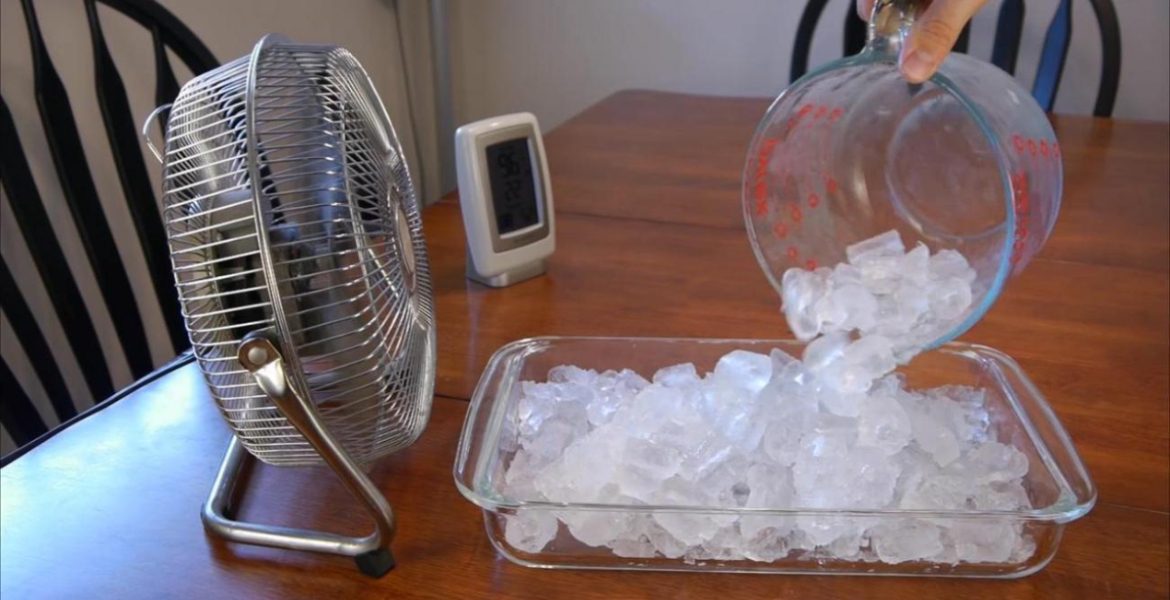 تبريد الهواء بالماء، ويمكن وضع أوعية من الماء البارد أو مكعبات الثلج أمام المروحة، ما يساعد على نشر الهواء البارد في الغرفة كما يمكن تعليق قطعة قماش مبللة بالماء أمام النوافذ ليمر الهواء من خلالها، فيصبح أكثر رطوبة وبرودة.