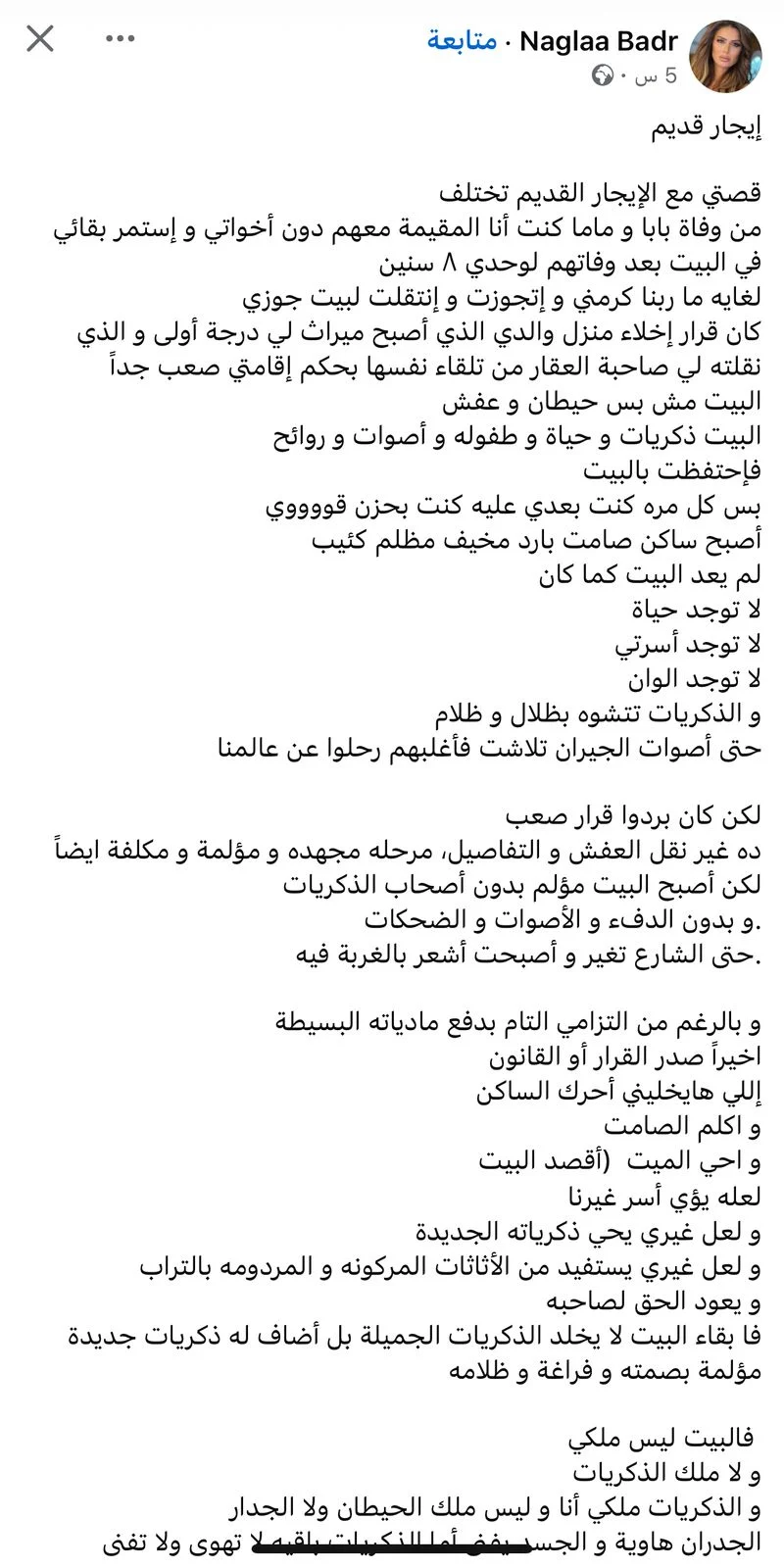 قصة نجلاء بدر تذكير قوي بأن البيوت ليست مجرد طوب وأسمنت، بل أماكن تحمل أرواح من سكنوها. ومع أن القوانين قد تغيّر مصير هذه الأماكن، إلا أن الذكريات تظل حية في القلوب، تتجاوز حدود الجدران.