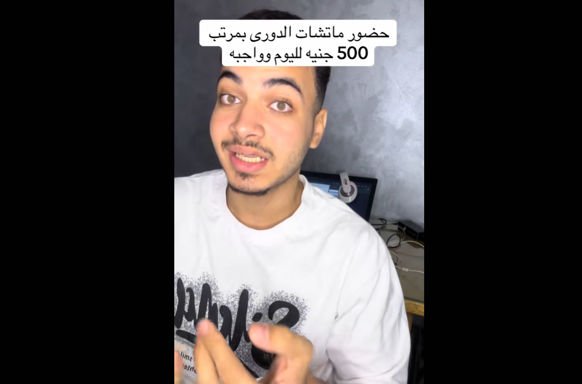 وقال شاب يُدعى يوسف أحمد عبر حسابه على منصة تيك توك: "محتاجين ناس تبدأ تحضر معانا مباريات الدوري الممتاز، مقابل 500 جنيه في اليوم ووجبة".