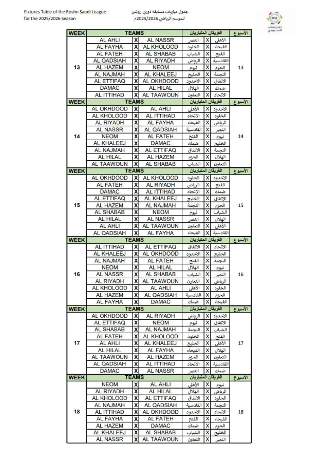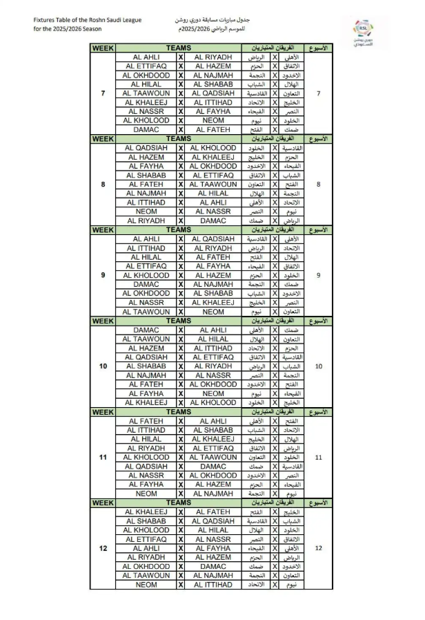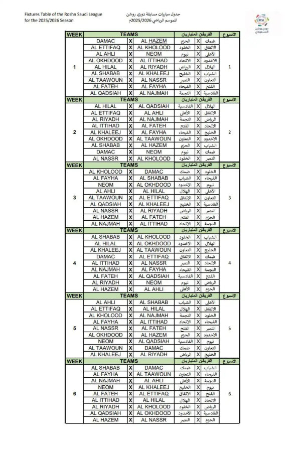 أزاحت إدارة المسابقات في رابطة الدوري السعودي للمحترفين الستار عن جدول مباريات دوري روشن للموسم الرياضي 2026-2025، الذي سينطلق الخميس 28 أغسطس 2025.