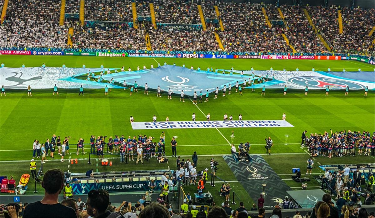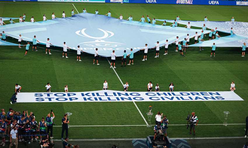 "توقفوا عن قتل الأطفال والمدنيين".. رسالة نهائي كأس السوبر الأوروبي