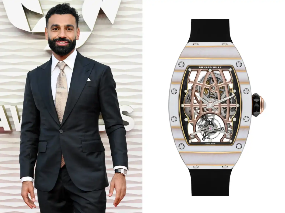 ظهر النجم المصري محمد صلاح في الحفل بساعة جذابة من علامة ريتشارد ميل التي تتميز بالدقة والتميز وتبلغ قيمتها 554 ألف دولار وهي ساعة باهظة الثمن.