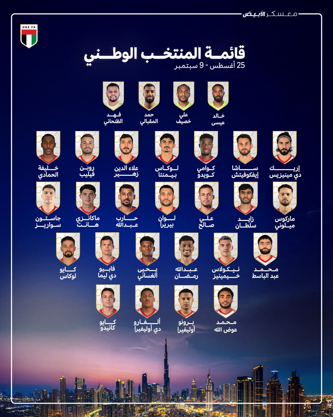 استدعى الروماني أولاريو كوزمين، المدير الفني لمنتخب الإمارات، 28 لاعبًا إلى المعسكر الداخلي في دبي، والذي ينطلق اليوم الاثنين ويستمر حتى 9 سبتمبر، استعدادًا لخوض الملحق الآسيوي المؤهل إلى كأس العالم 2026.