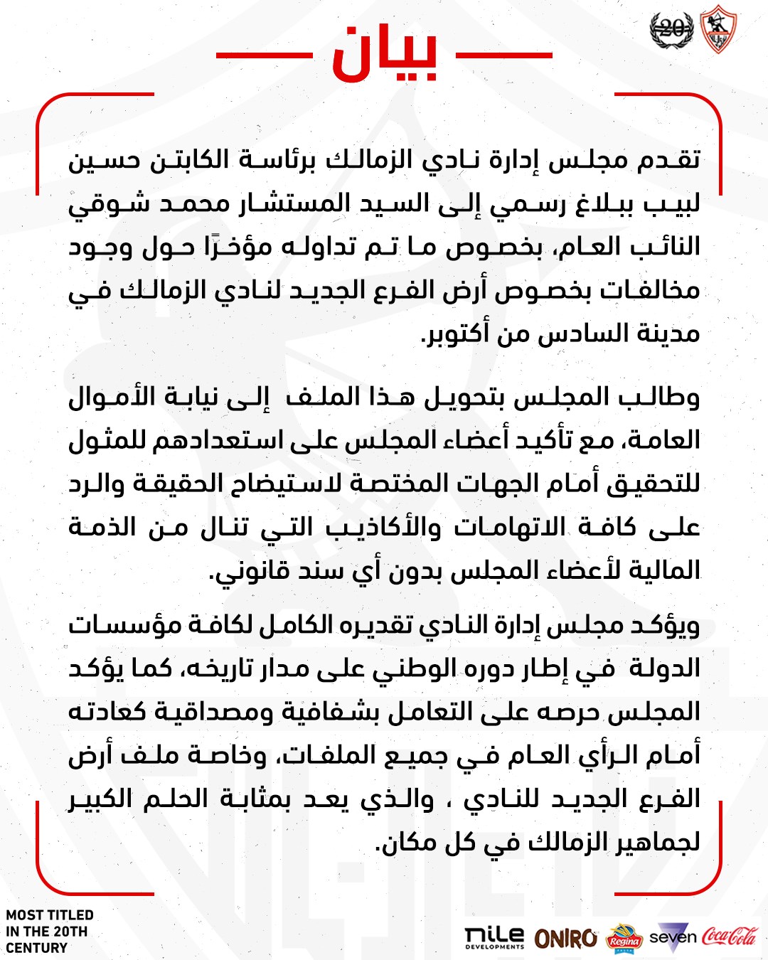ونشرت الصفحة الرسمية لنادي الزمالك عبر موقع التواصل الاجتماعي "فيس بوك": "تقدم مجلس إدارة نادي الزمالك ببلاغ رسمي إلى المستشار محمد شوقي النائب العام، بخصوص ما تم تداوله مؤخرًا حول وجود مخالفات بخصوص أرض الفرع الجديد لنادي الزمالك في مدينة السادس من أكتوبر".
