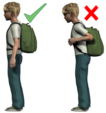 وحمل حقيبة المدرسة على كتف واحد يسبب خللا في توازن الجسم ويجبر الطفل على اتخاذ وضعية غير طبيعية أثناء المشي ولذلك ينصح الأطباء باستخدام الحقيبة ذات الحمالتين العريضتين والمبطنتين، مع ضرورة ضبط طولها بحيث تستقر على منتصف الظهر لا أسفله، كما يفضل أن تكون مزودة بحزام يربط عند الخصر لتوزيع الحمل بشكل متوازن.