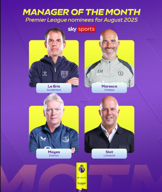 وتصدر قائمة المدربين المرشحين لجائزة أفضل مدرب في أغسطس بالدوري الإنجليزي، الهولندي آرني سلوت المدير الفني لفريق ليفربول، وإنزو ماريسكا (تشيلسي)، ديفيد مويس (وست هام)، لو بريس (سندرلاند).