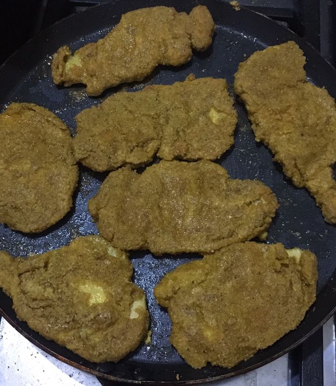 - وبعد ذلك يتم غمس صدور الدجاج في الشوفان المطحون أو البقسماط الأسمر.