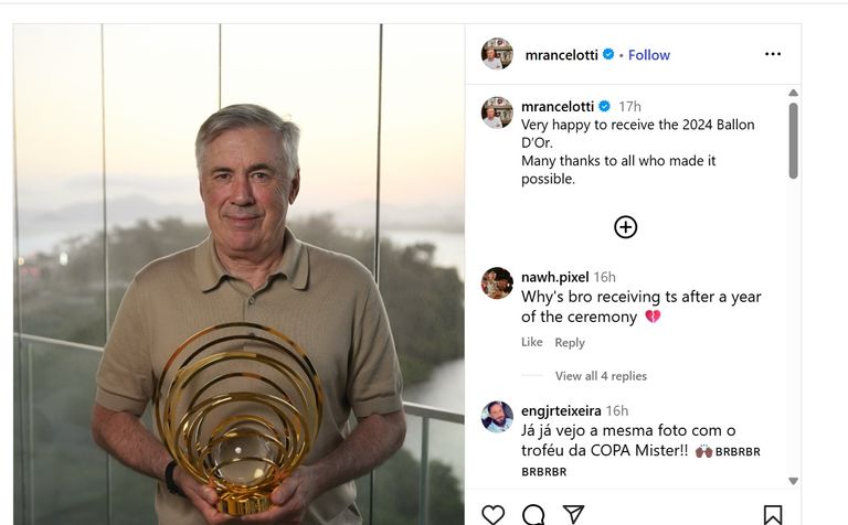 ومن جانبه، كشف أنشيلوتي الذي ترك تدريب ريال مدريد في صيف 2025 ليقود منتخب البرازيل أنه تحصل على جائزة أفضل مدرب في العالم عن عام 2024 والتي لم يتمكن من التتويج بها أثناء وجوده على رأس الجهاز الفني للميرينجي.