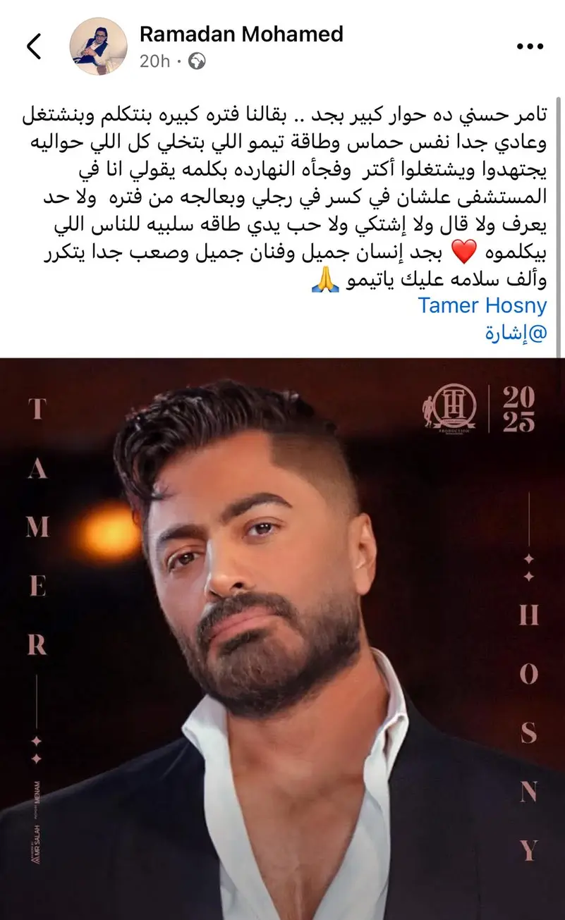 وأضاف رمضان أن تامر فضّل إخفاء إصابته حتى لا ينقل طاقة سلبية لمن حوله، وهو ما يعكس حرصه الدائم على أن يظل مصدر إلهام وطاقة لجمهوره وفريق عمله.