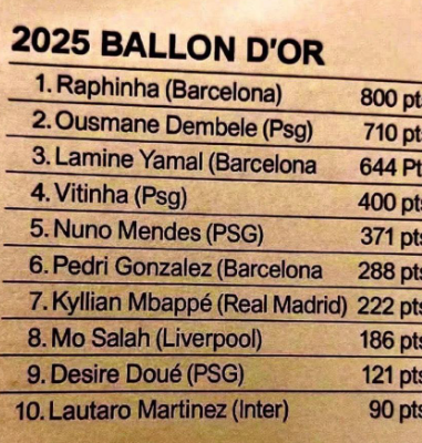 واجتاحت مواقع التواصل الاجتماعي صورة مسرّبة يُزعم أنها تُظهر النتائج النهائية لجائزة الكرة الذهبية لهذا العام، وتصدرها البرازيلي رافينيا، جناح برشلونة، قبيل الحدث بساعات، في مفاجأة قلبت التوقعات وأثارت جدلًا واسعًا في الأوساط الرياضية والإعلامية.