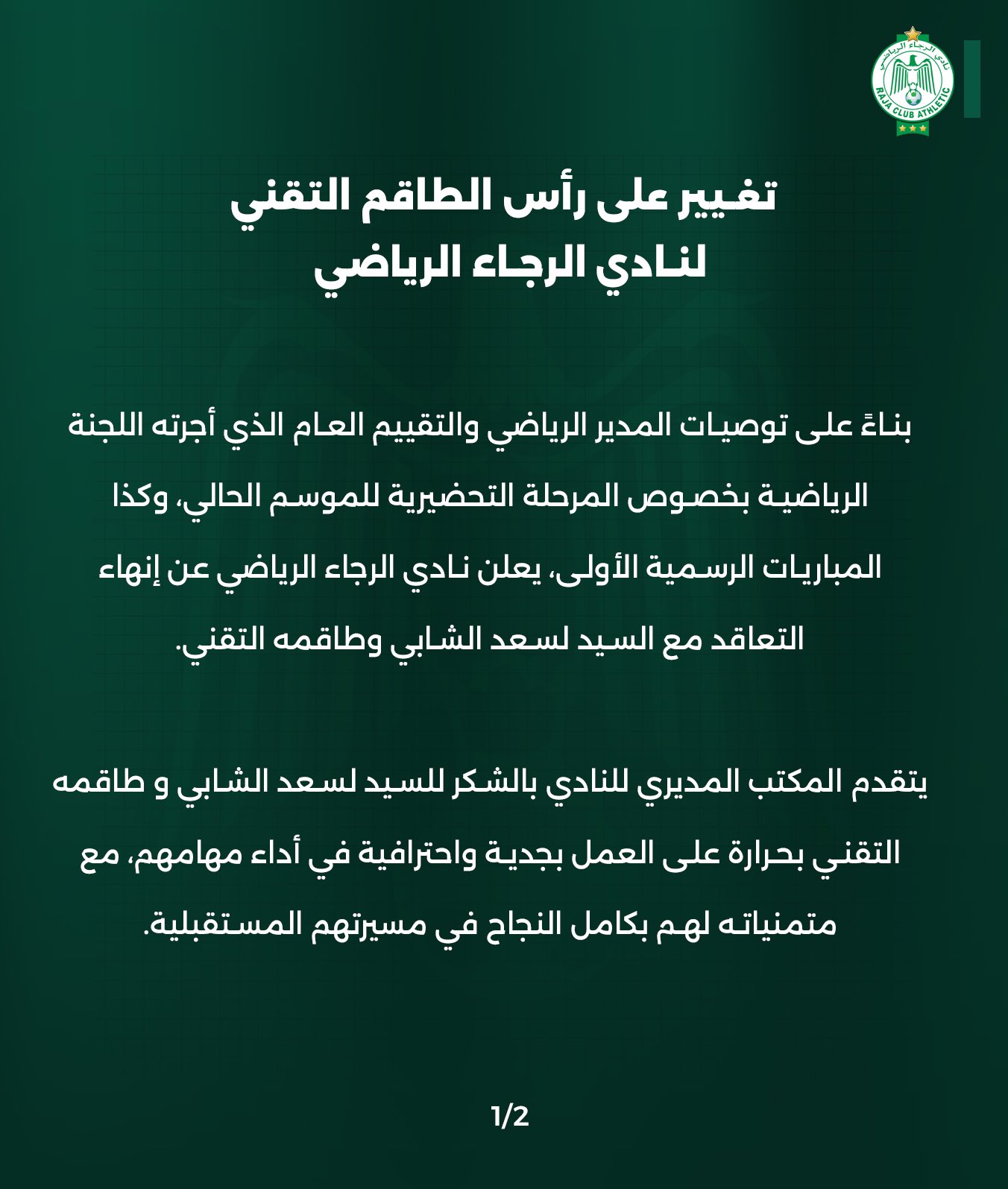 وأنهي الرجاء تعاقده مع المدرب التونسي لسعد جردة الشابي، بعد تقييم شامل لأداء الفريق مع بداية الموسم.