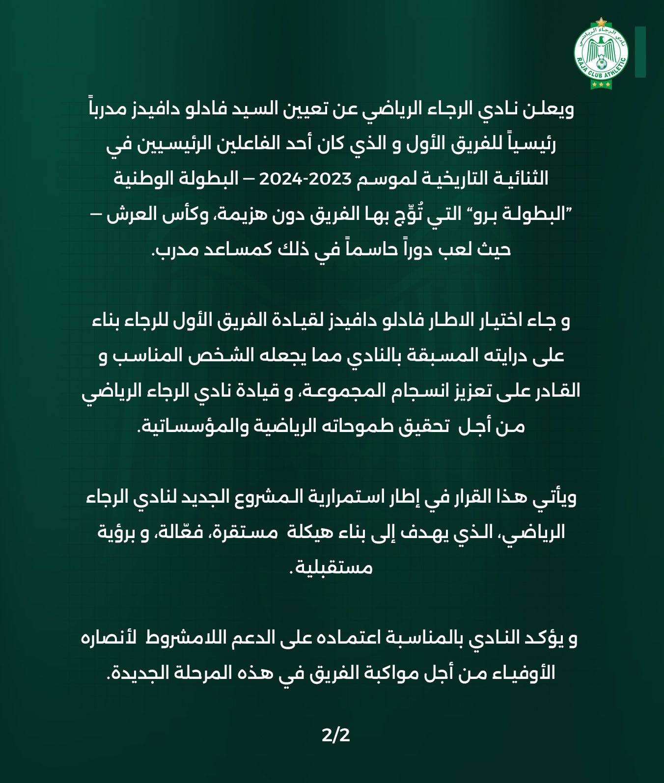 وكان الجنوب إفريقي فادلو دافيدز مساعدًا للمدرب خلال موسم 2023-2024، حين حقق الرجاء ثنائية تاريخية بالتتويج بالبطولة الاحترافية دون هزيمة وكأس العرش.
