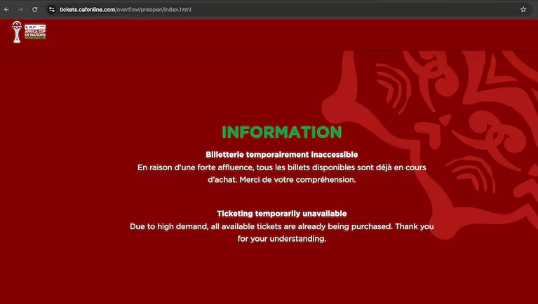 ومع حلول ظهر يوم الخميس 25 سبتمبر، دخل آلاف المشجعين إلى المنصة الإلكترونية الخاصة بحجز التذاكر التابعة لـ كاف لشراء تذاكرهم لمباريات كأس أمم إفريقيا المغرب 2025، ولكن بعد دقائق قليلة من بدء بيع التذاكر، لم تتمكن المنصة من استيعاب هذا التدفق الهائل، وسرعان ما أصبح الموقع غير متاح، مما منع العديد من المشجعين من إتمام حجوزاتهم.