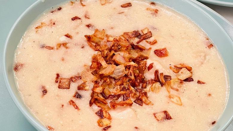 ثم يسكب الكشك في الأطباق ويزين بالبصل المحمر، ليصبح جاهزا للتقديم.
