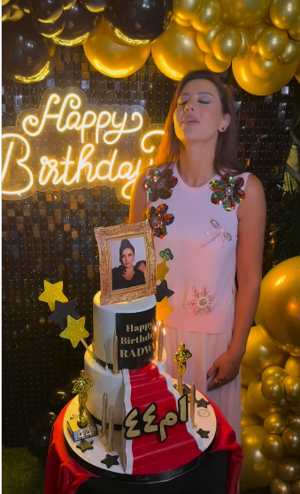 كما ظهر على التورتة الرقم 44، وهو سنها الحالي، ولكنها أرفقته بطريقة مازحة مع متابعيها بكتابة "أم 44"، مضيفة لمسة خفيفة من الدعابة والمرح على احتفالها.