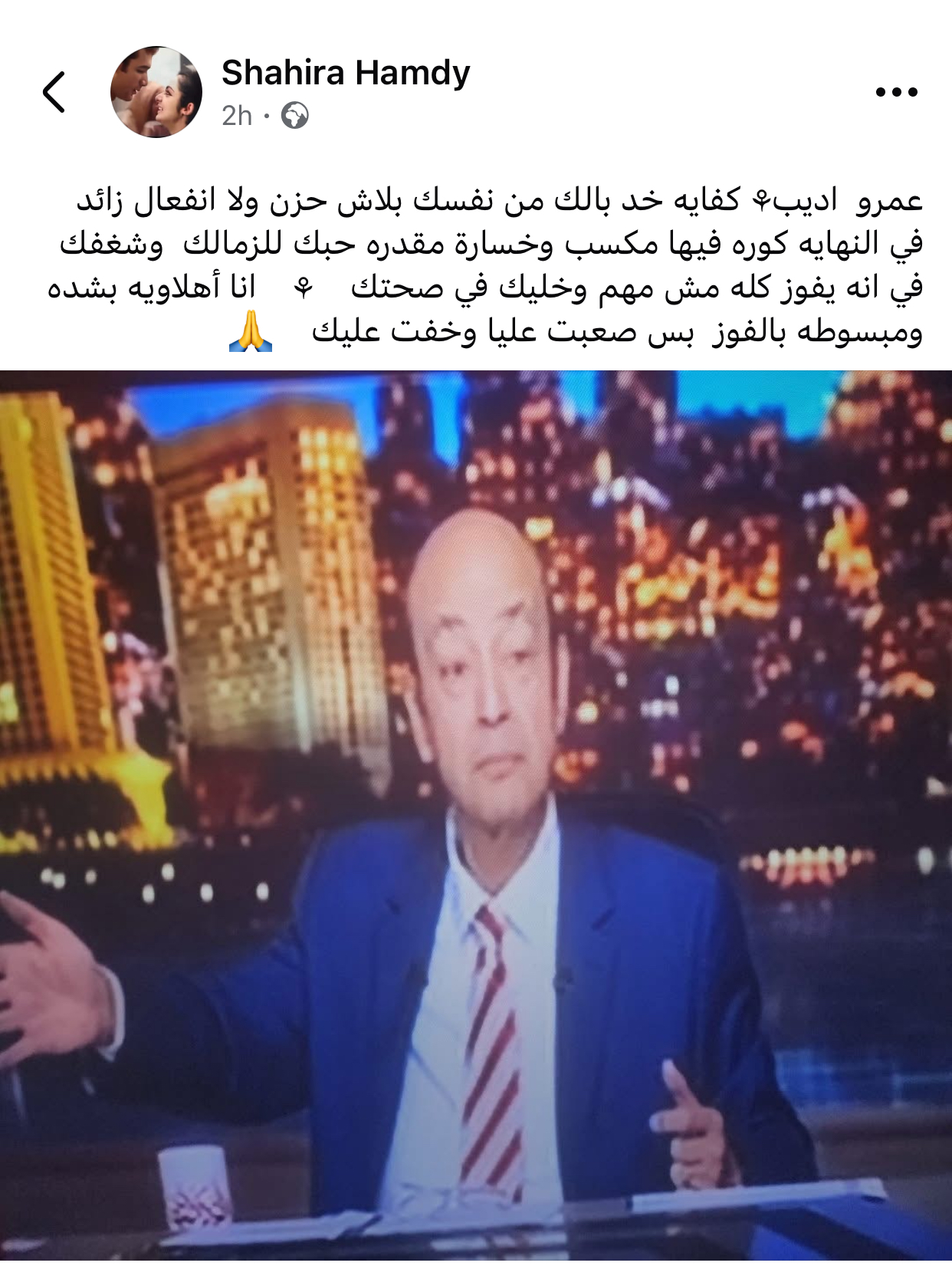 بعد الخسارة الأخيرة لنادي الزمالك أمام الأهلي في مباراة القمة ضمن منافسات الدوري المصري الممتاز، وجهت الفنانة شهيرة رسالة دعم للإعلامي عمرو أديب عبر حسابها على فيسبوك، مؤكدة تعاطفها معه رغم انتمائها وتشجيعها الكبير للفريق المنافس، الأهلي.