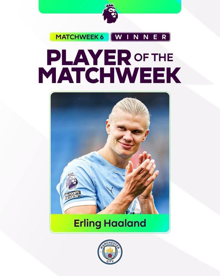 حصد النجم النرويجي إيرلينج هالاند مهاجم مانشستر سيتي جائزة أفضل لاعب في الجولة السادسة من الدوري الإنجليزي الممتاز، بعد أن قاد فريقه لانتصار كبير على بيرنلي بخماسية مقابل هدف.
