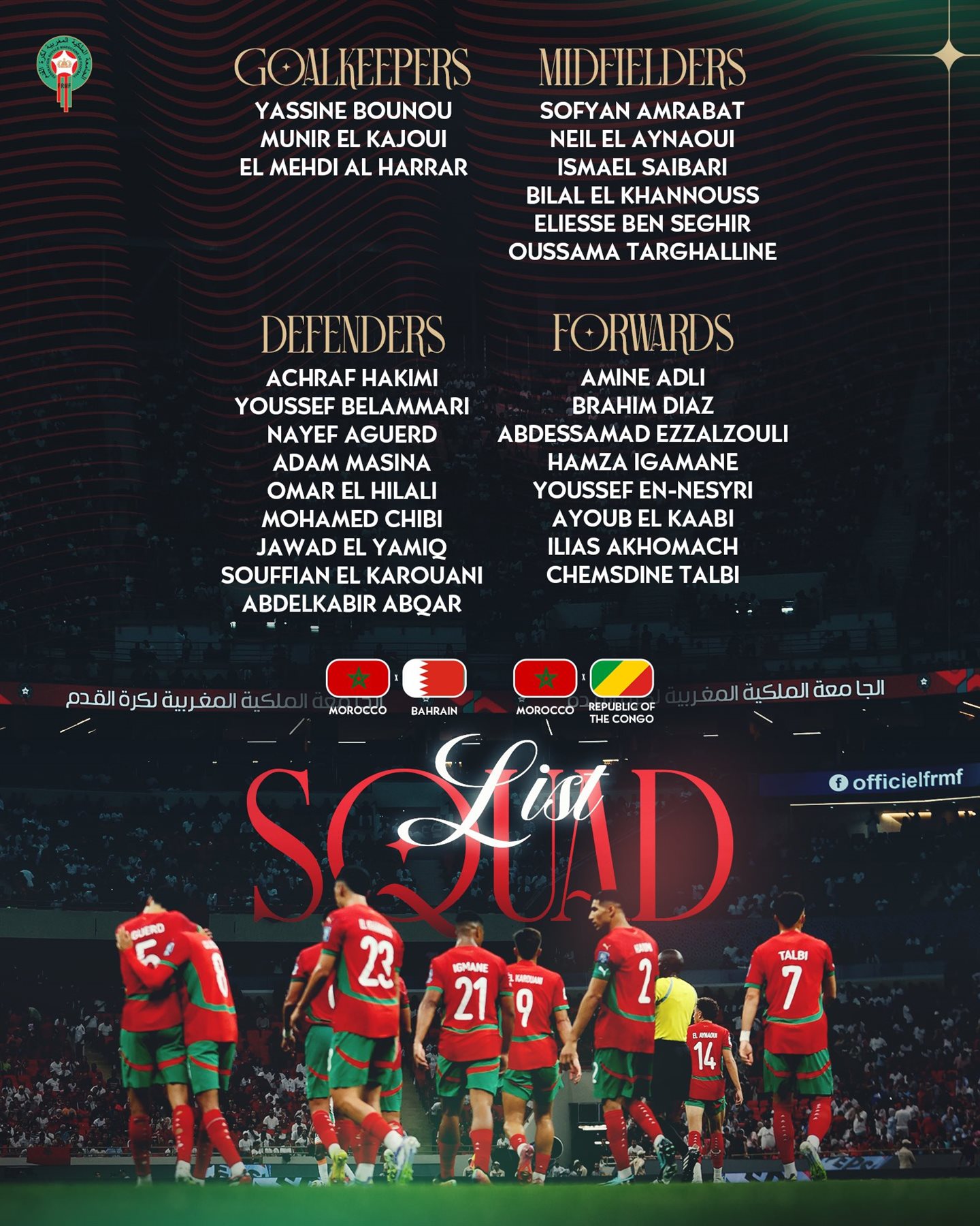ويخوض المنتخب المغربي خلال معسكر أكتوبر مباراة ودية ضد منتخب البحرين، وأخرى أمام منتخب الكونغو ضمن تصفيات كأس العالم 2026.